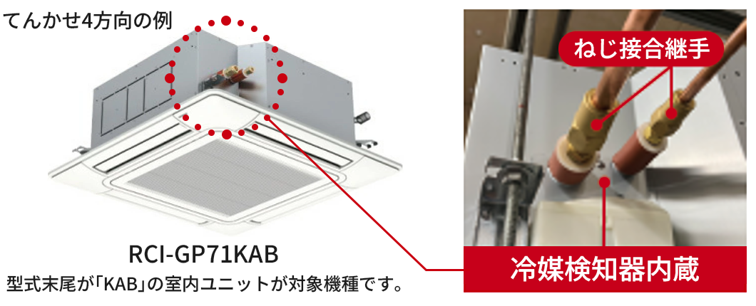 冷媒検知器を内蔵し、さらにねじ接合継手を同梱※1した室内ユニットを新たにラインアップしました。