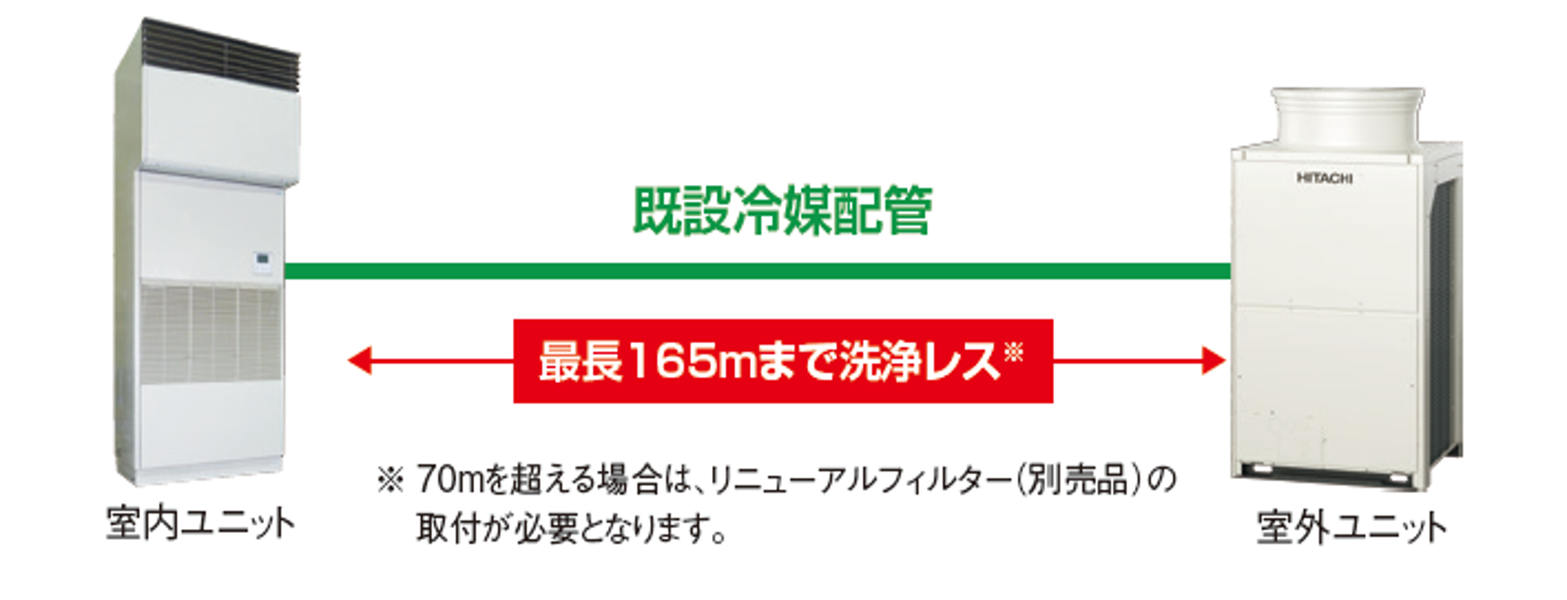 総配管長70mまで洗浄レスで既設配管を流用することができます。