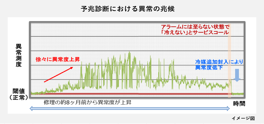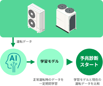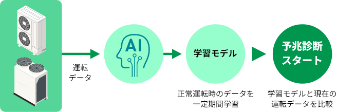 お客さまの使用環境や用途で異なる正常運転時のデータを一定期間学習し※1、構築された学習モデルと現在の運転データを比較することで、冷凍サイクルに関連する故障※2の兆候を検出※3。