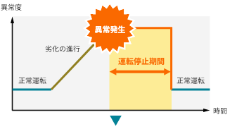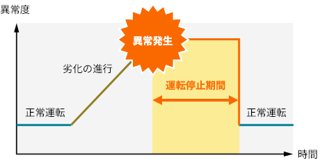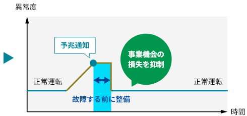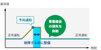 故障につながる運転データの変化を検知できるため、設備機器が停止する前にメンテナンスが可能。故障停止の長期化を防ぎ、設備故障による事業機会の損失を抑制します。