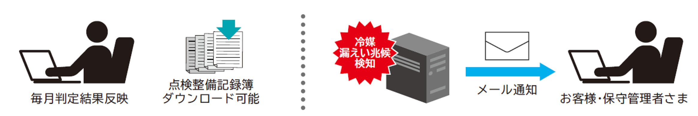 遠隔監視で採取した稼働データをもとに、毎日自動診断を行います。毎月月末には漏えい兆候の有無を過去3か月分のデータで総合判定し Web上に反映します。※4・※5 点検整備記録簿も自動で作成されいつでもダウンロード可能です。万が一フロン類の漏えい兆候を検知した場合は、保守管理者様又はお客様へ通知します。
