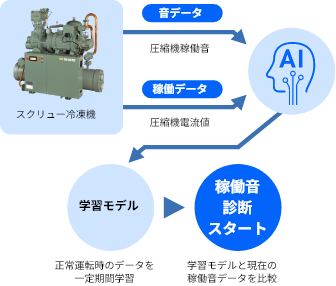 圧縮機の稼働音と電流値を機械学習し、機器固有の学習モデルを構築。収集した稼働音データと学習モデルの差異を監視することで圧縮機軸受部の摩耗損傷の有無を検知。