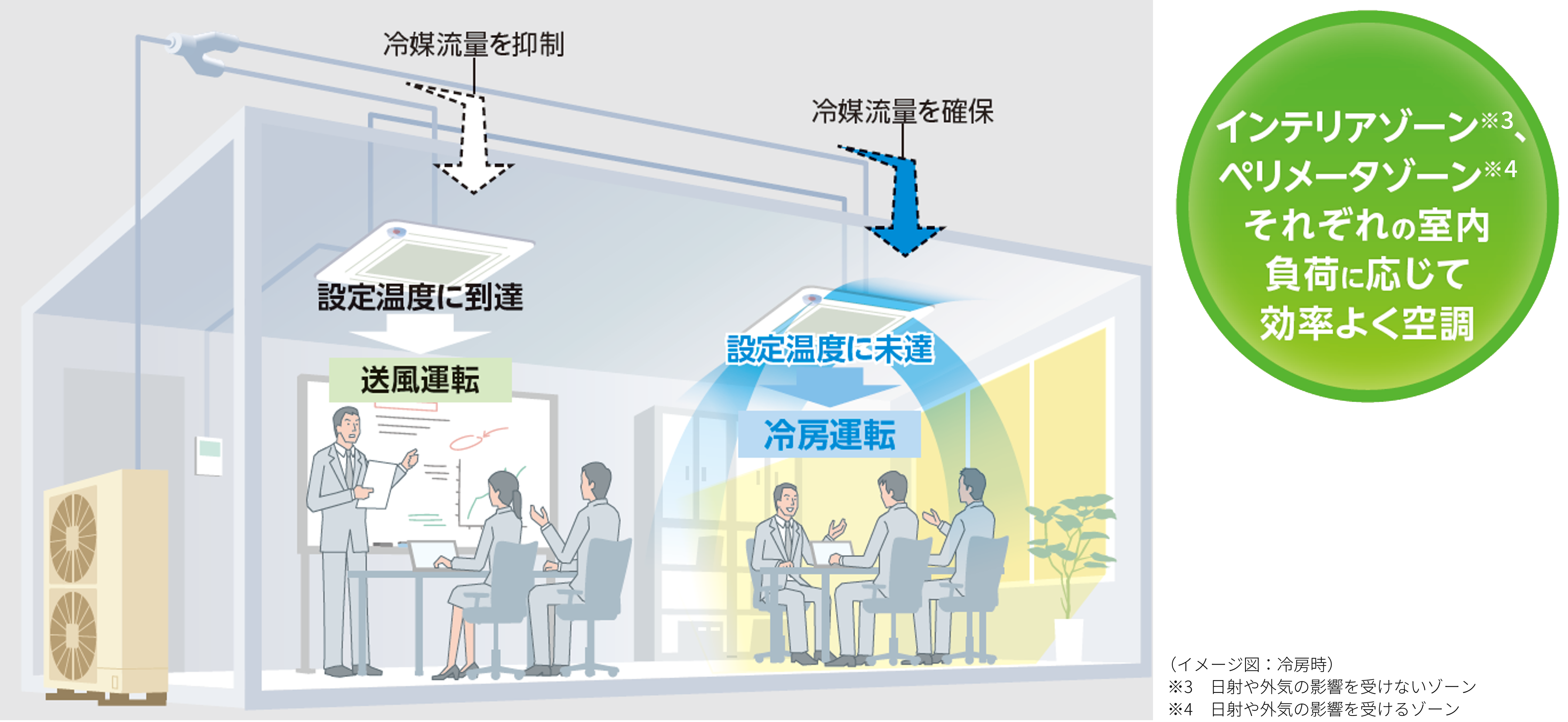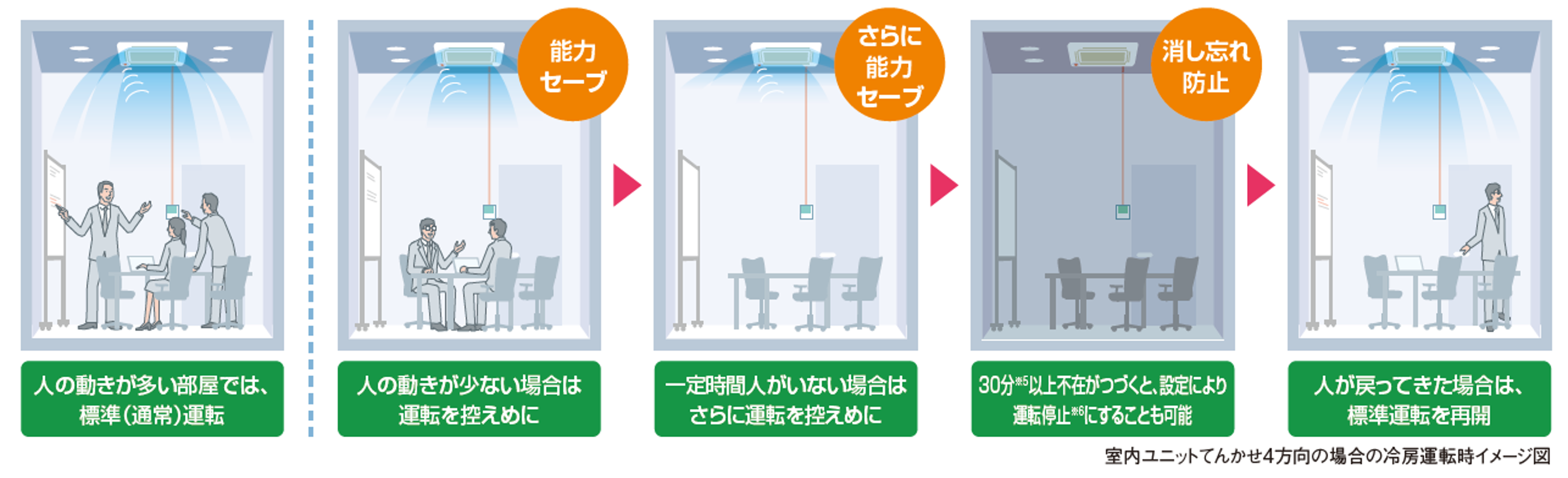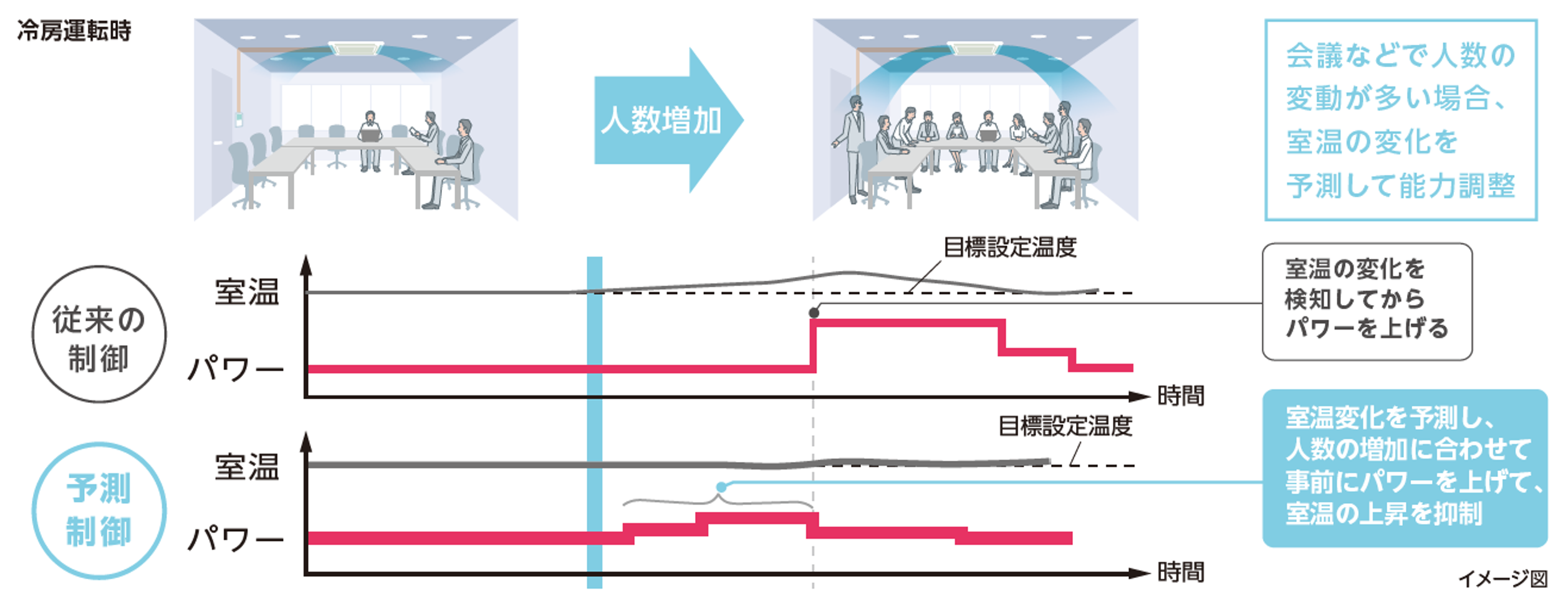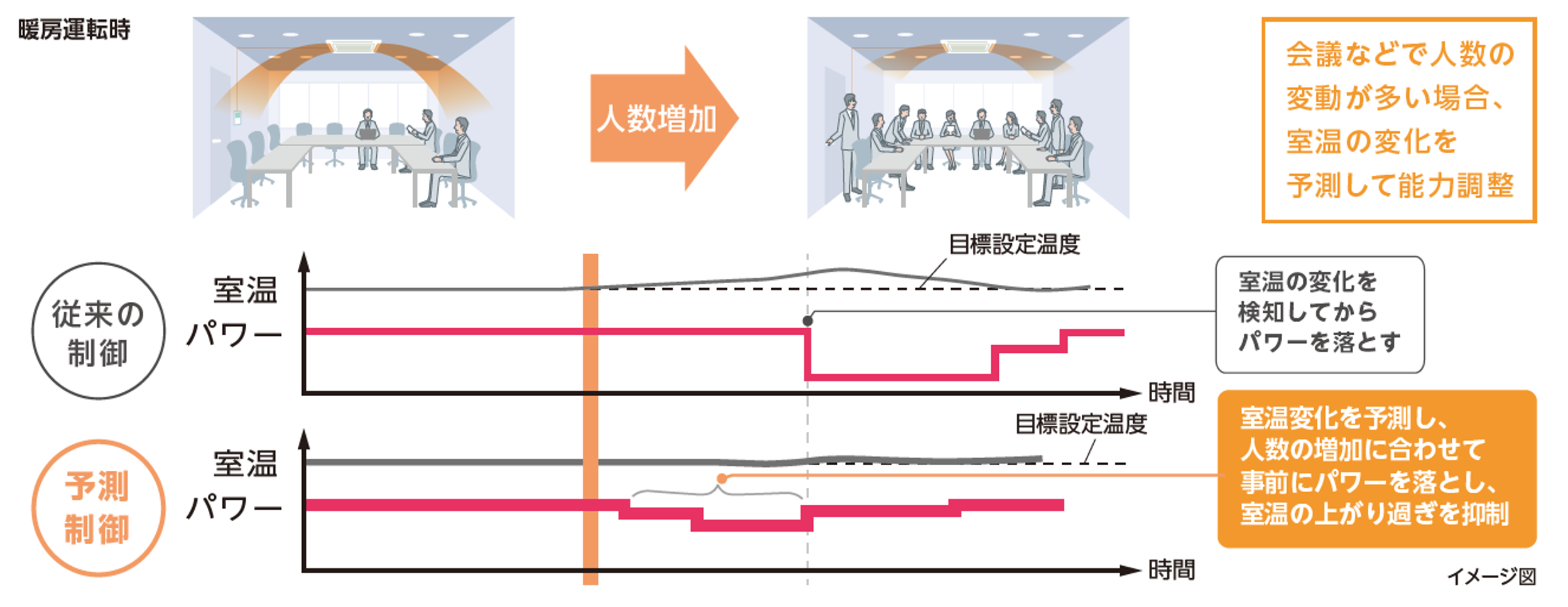 人感センサーと輻射温度センサーがエリア内の人の増減や熱源の変化を検知し、室温変化を予測。空調能力を調整し、室温の変動を抑えます。