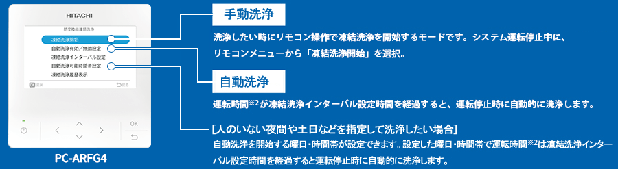 室外ユニット設定※1によりリモコンから自動洗浄、手動洗浄を選択して設定できます。また、人のいない夜間や土日などを指定して洗浄することもできます(自動洗浄可能時間帯設定)。