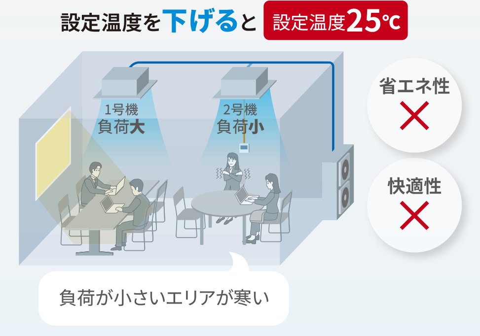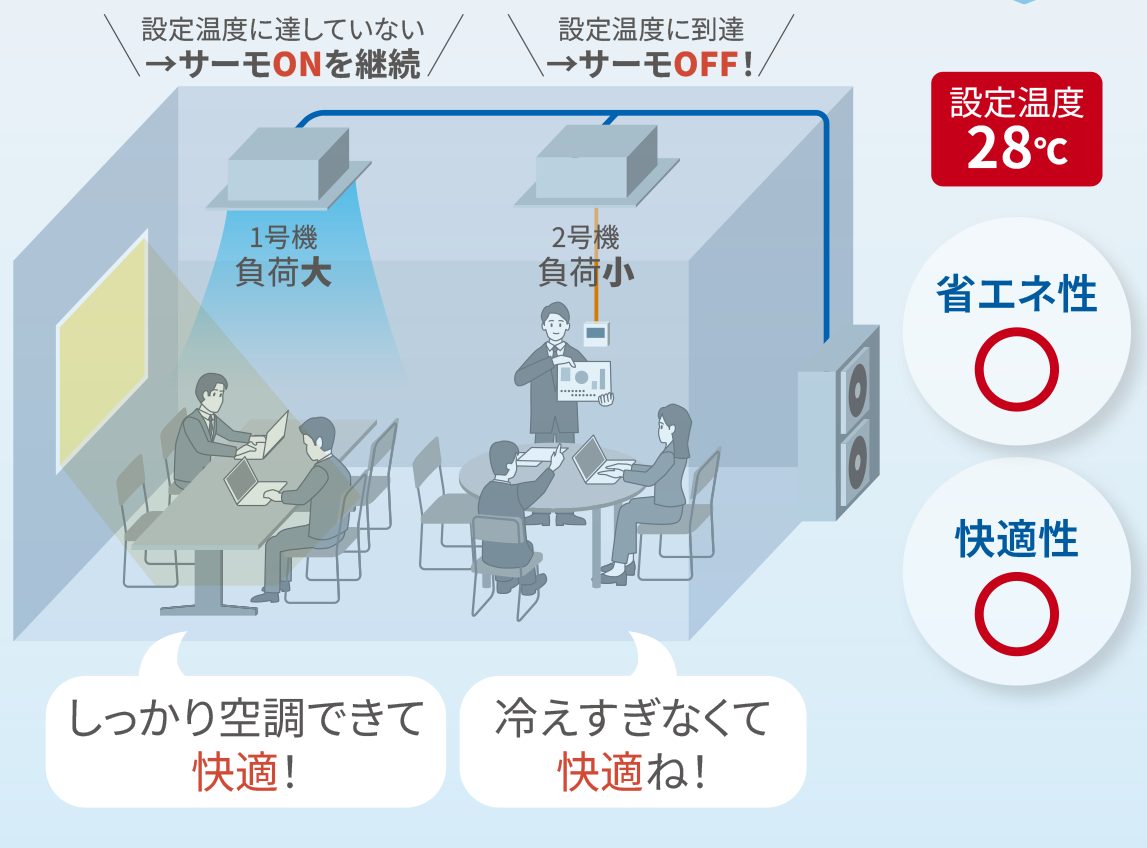 1部屋を複数の室内ユニットの同時運転で空調するとき、リモコン設定温度と吸込空気温度に応じて室内ユニットごとに冷媒流量を調整することができるので、快適性を維持しつつ省エネ運転が可能です。