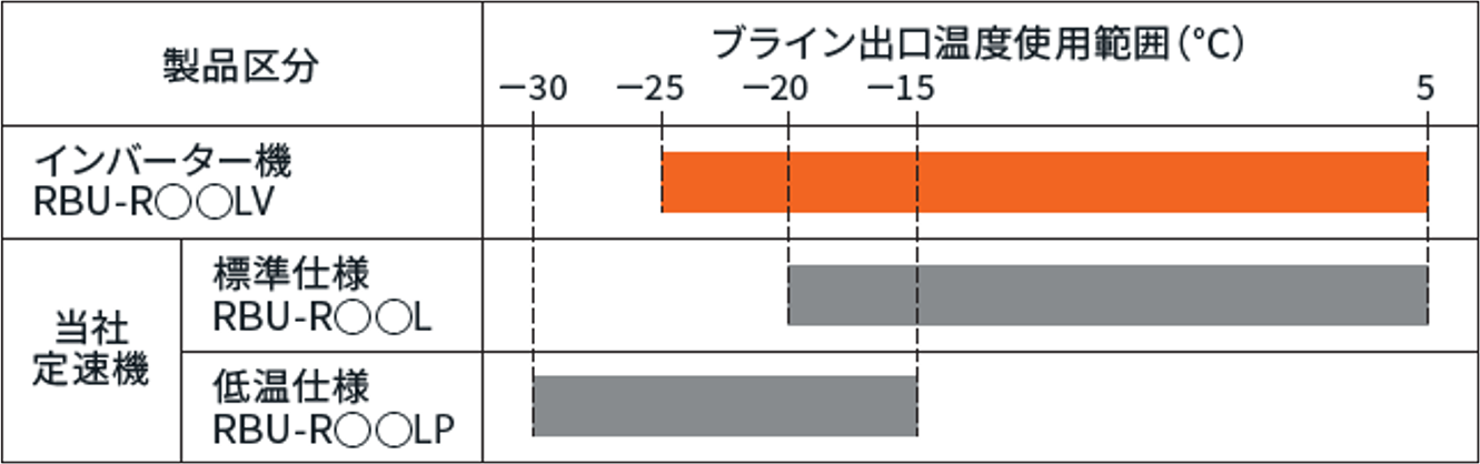 インバーター機はブライン出口温度の下限値を-25℃まで拡大しました。