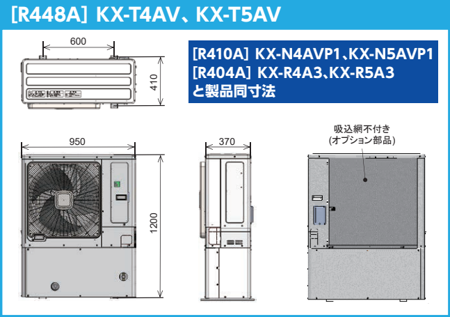 | 3.7kW(5馬力) | KX-T5CV | KX-R5C1 | Φ25.4(ろう付け接続) | Φ12.7(フレア接続) | Φ12.7(フレア接続) | Φ15.88(フレア接続) |