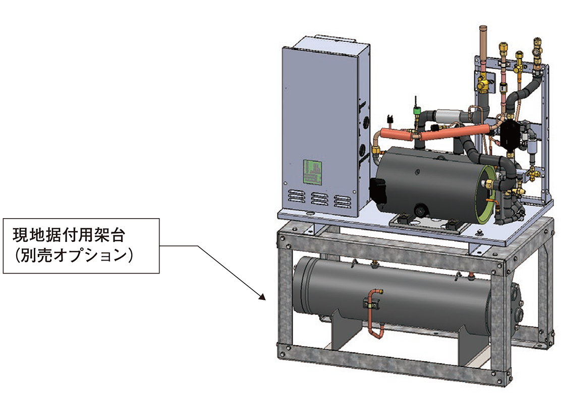 水冷コンデンサーと現地据付用架台は独立するため、現地の状況により水冷コンデンサーの位置調整が可能です。