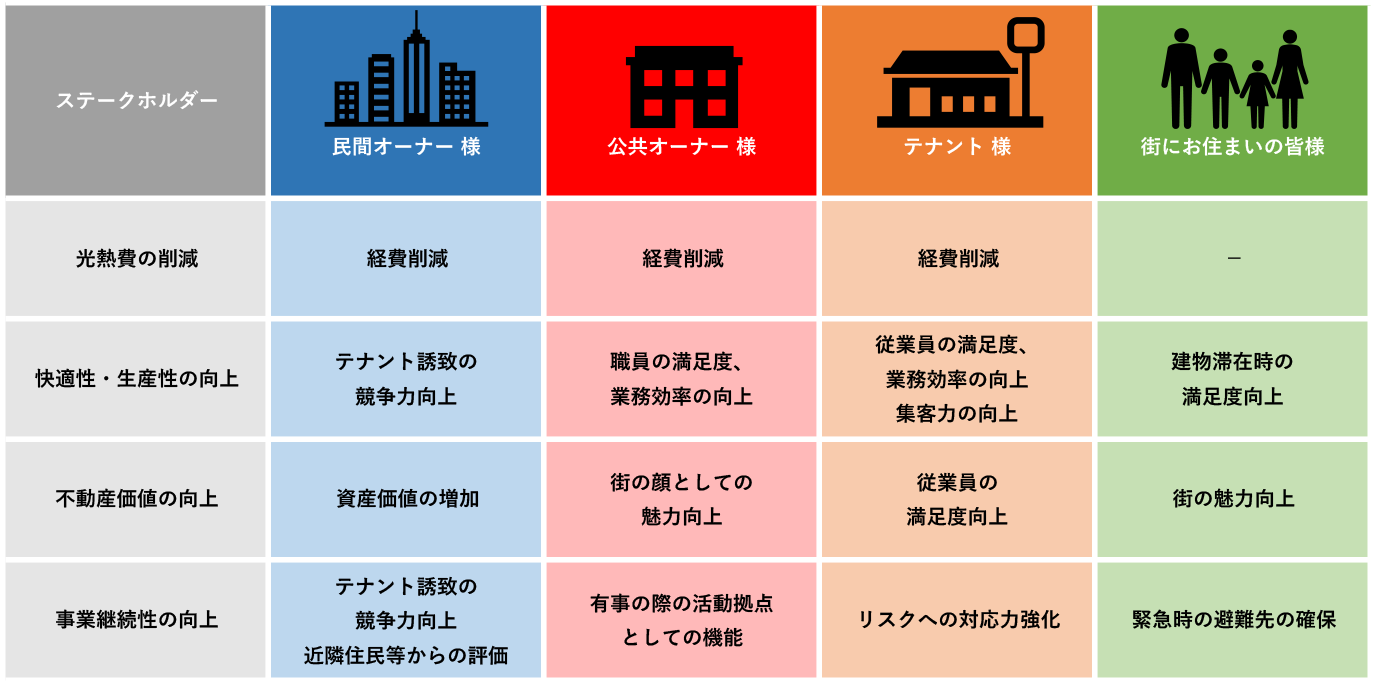 ZEBには、エネルギー消費量が削減できること以外にも様々なメリットがあります。具体的には、大きく以下の4点がZEBのメリットとして挙げられます。建物の関係者には、オーナー、働く人、訪れる人など、さまざまな立場の人がいます。その立場によって得られるメリットは異なるもののすべての人々に対してZEBのメリットは存在しています。そのため、ZEBを実現・普及させるためには、各立場の人々が自らのメリットを理解した上で協力していく事が必要です。